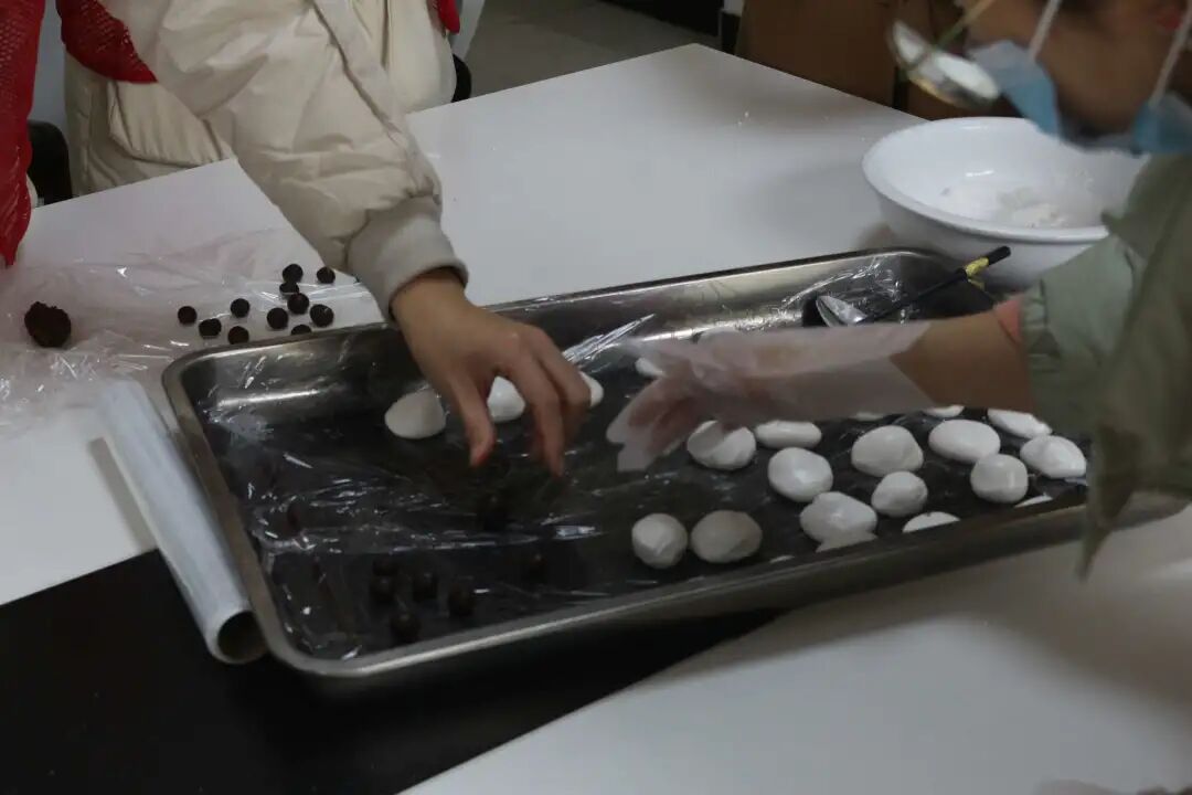 随后大家用提前准备好的糯米面粉、豆沙等开始制作元宵。大家揉面的揉面,拌馅的拌馅,搓、捏、按、团……一会儿工夫,一个个白白圆圆的元宵就亮相在桌面上。