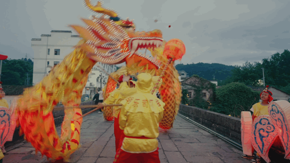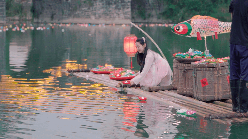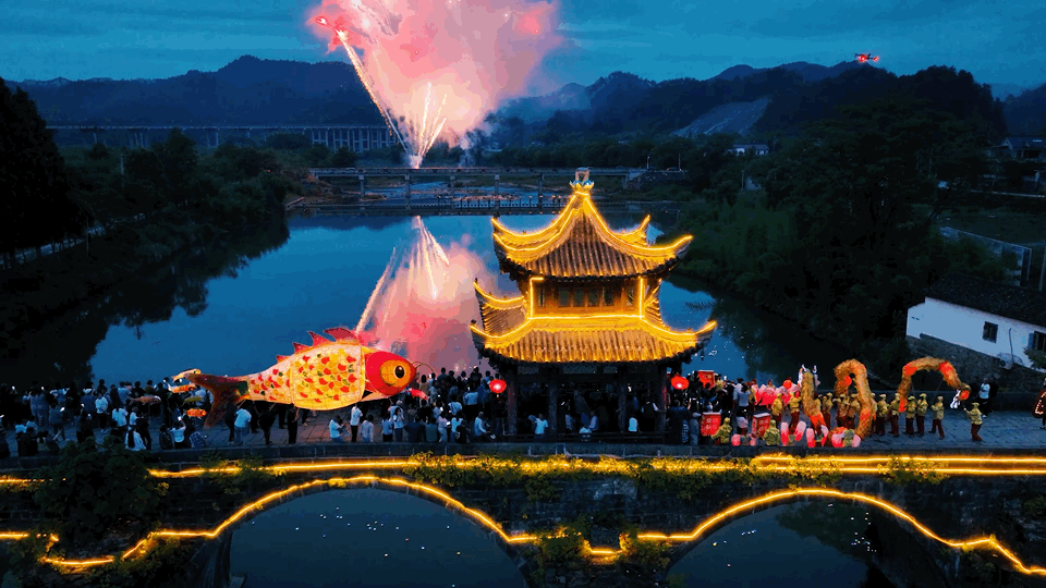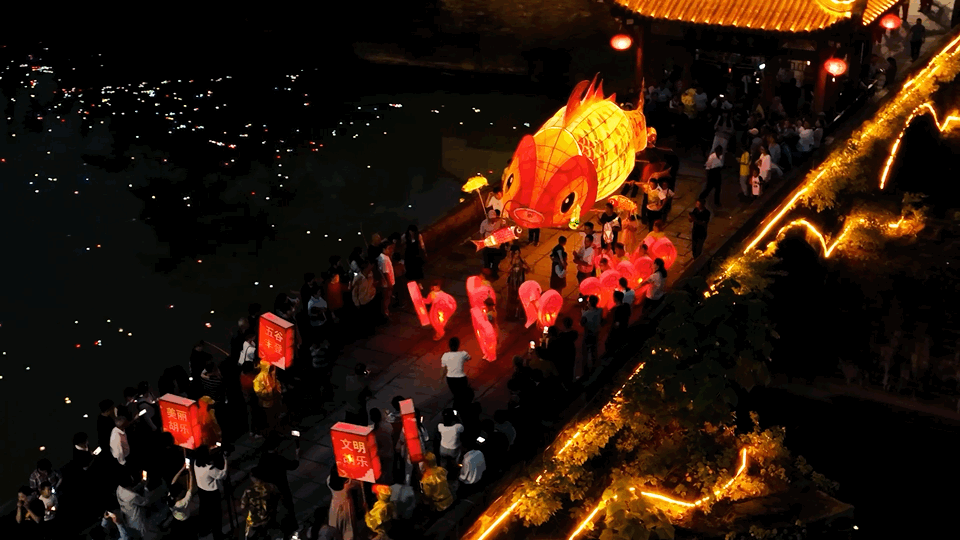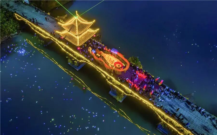 夜晚的胡乐古镇“三灯”齐聚:从空中俯瞰,金黄的龙灯在廉夫桥上表演、缤纷的鱼灯在景观坝上巡游、多彩的河灯在西津河上飘荡……把端午佳节的氛围直接拉满。