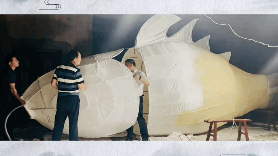 再蒙上白漂布,再按照各种鱼的首尾身形描线着色,制成各色鱼灯,鱼灯装上小灯泡,夜间舞动,最是壮观。