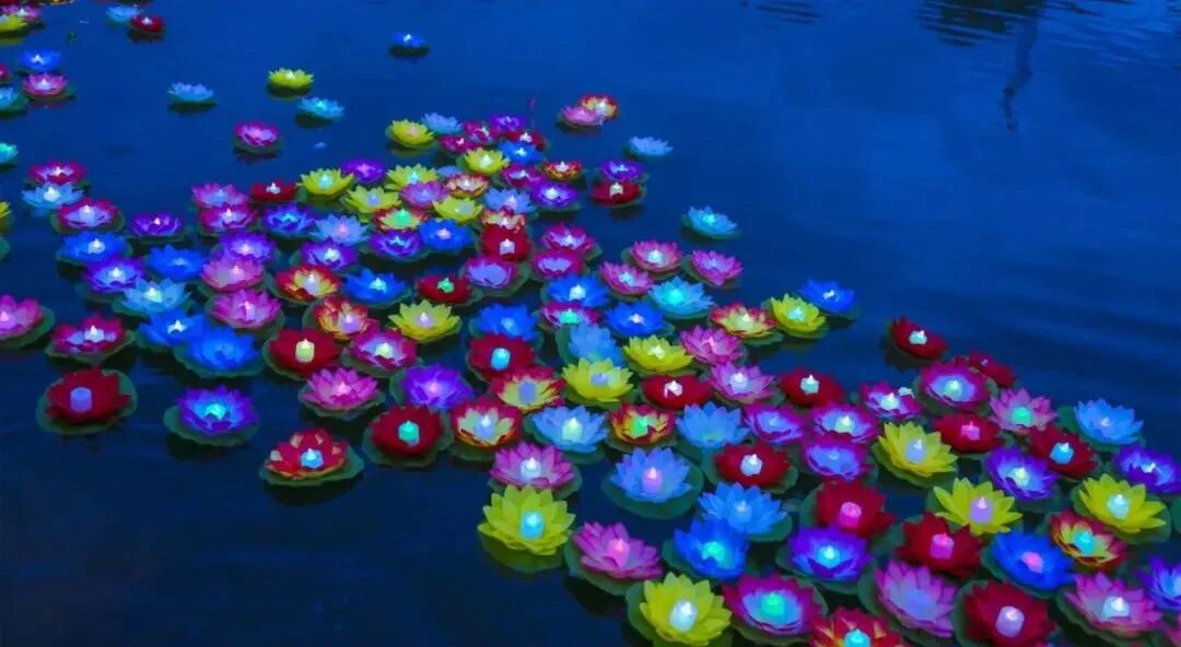 河灯的制作,准备材料:各色绢布、绿色塑料防水布、热熔胶、电子灯(蜡烛)等。