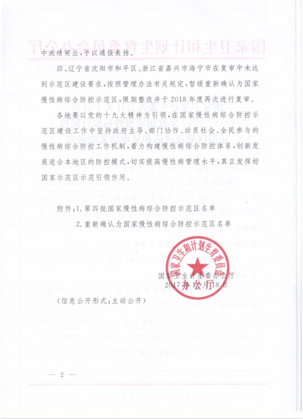 国家卫生计生委办公厅关于公布2016-2017年度国家慢性病综合防控示范区建设评估和复审结果的通知