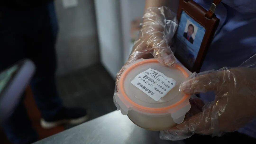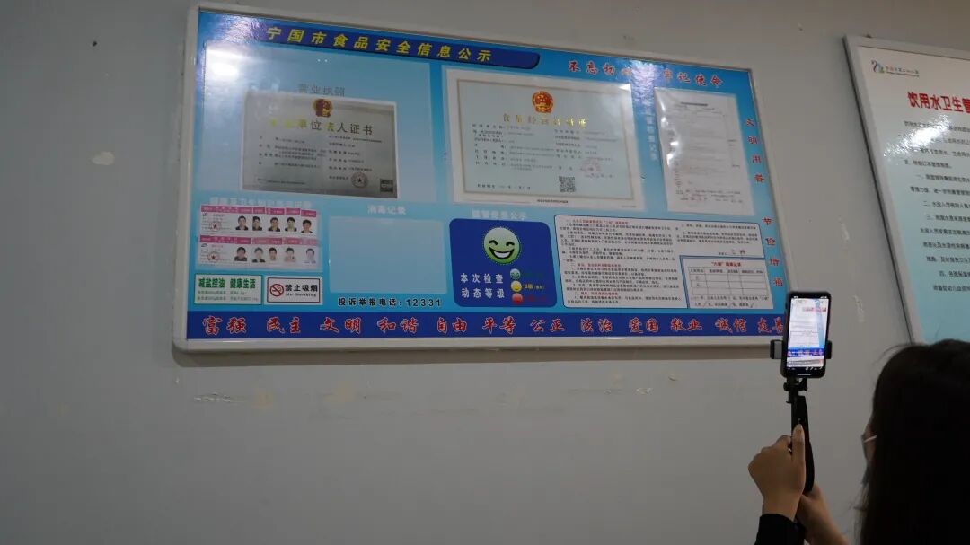 ▲学校食品安全公示栏信息齐全,按规定公示从业人员健康证明、监督检查信息等资料。