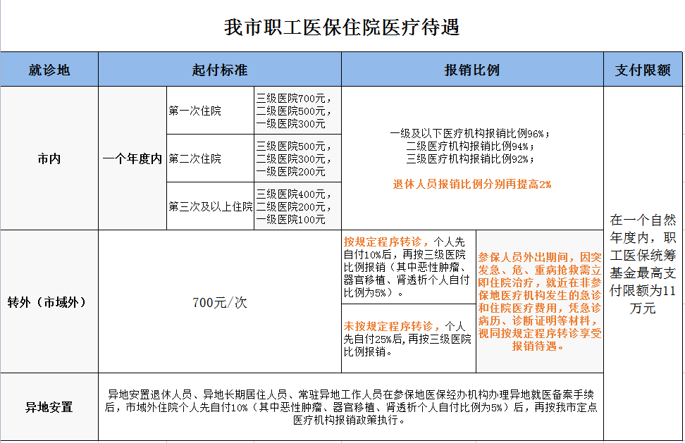 基本医疗保险待遇包括:门(急)诊待遇和住院类待遇,两者分别设置了起付标准、报销比例、支付限额。