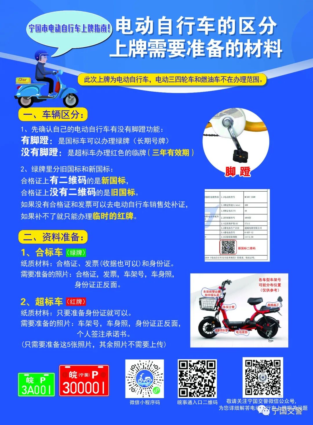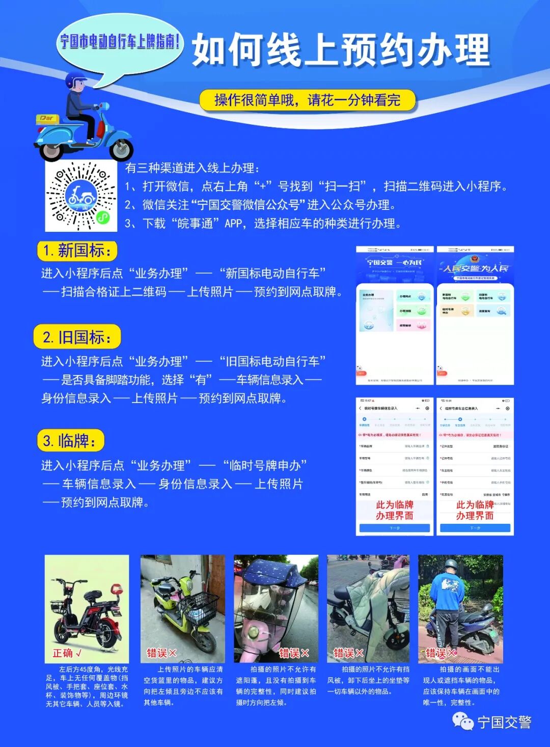 (1)电动车主可通过“皖事通”或“宁国交警微信公众号”网上申领。
