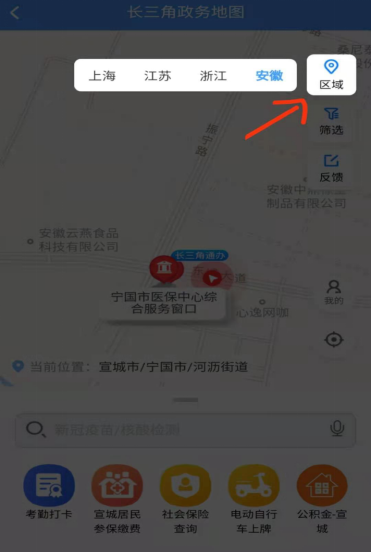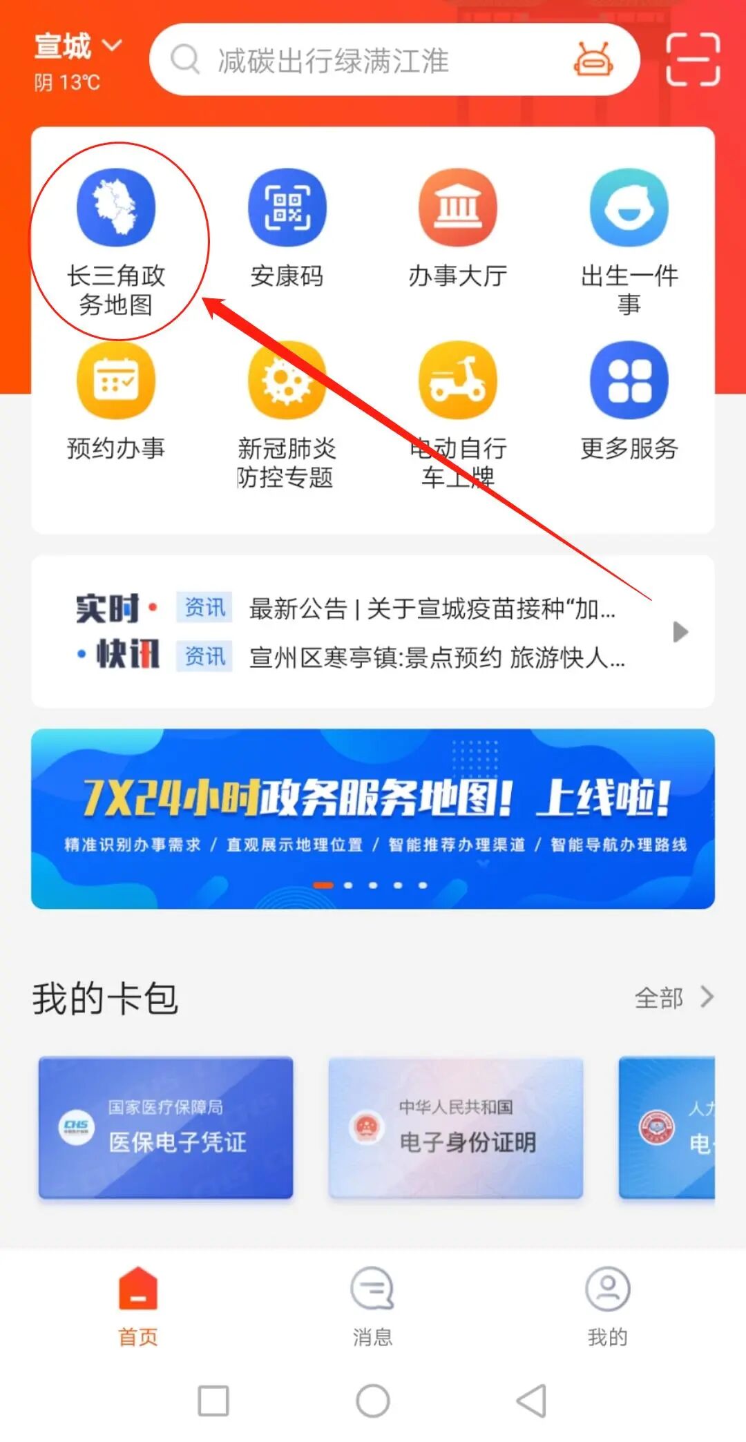 第一步:进入皖事通首页,找到【长三角政务地图】,点击进入