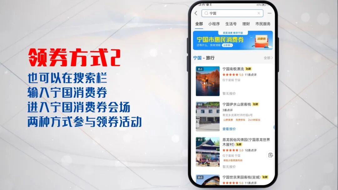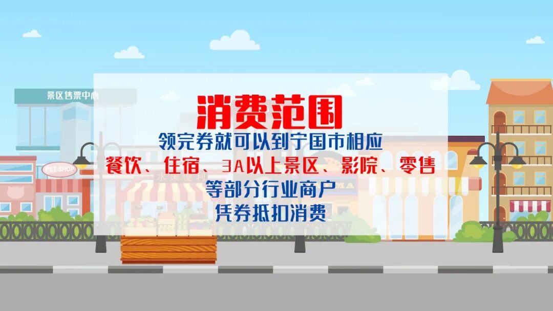 领完券就可以到宁国市相应餐饮、住宿、3A以上景区、影院、零售等部分行业商户,凭券抵扣消费。