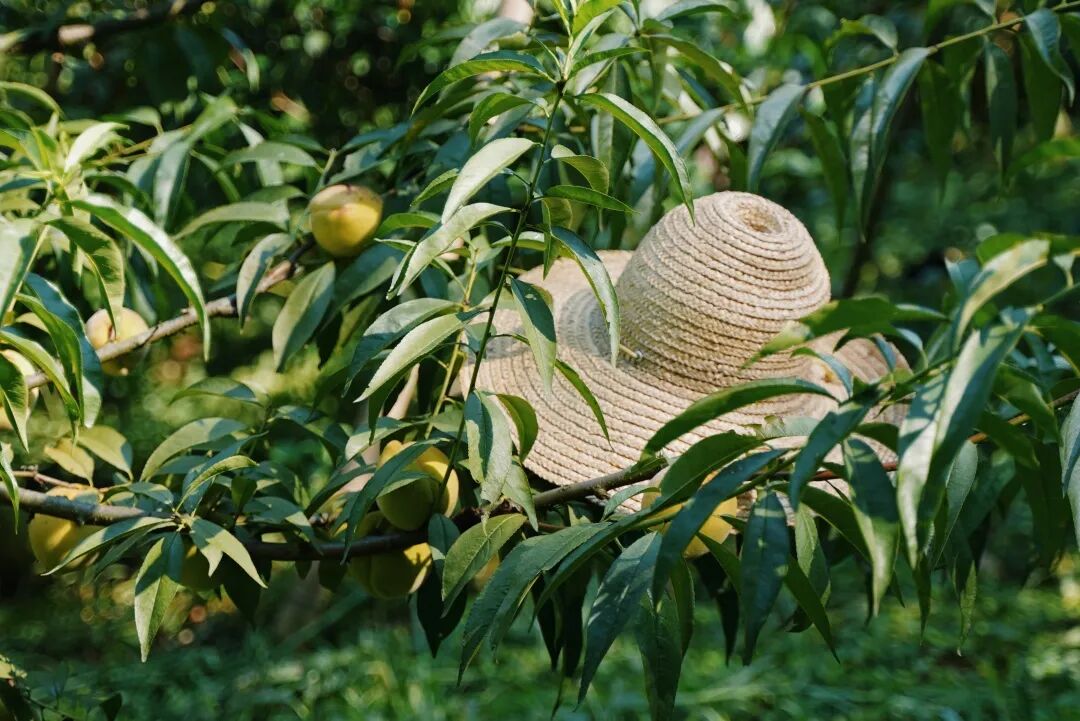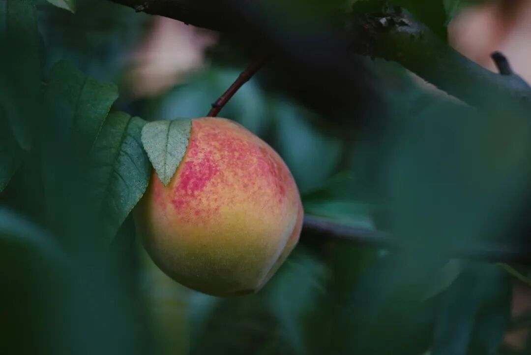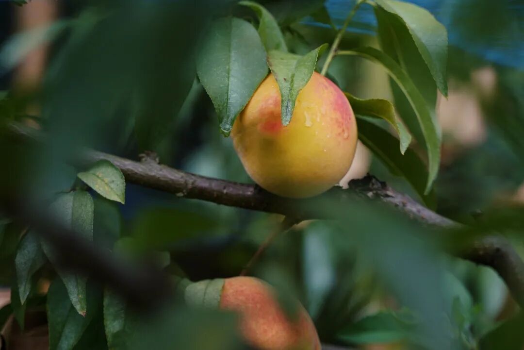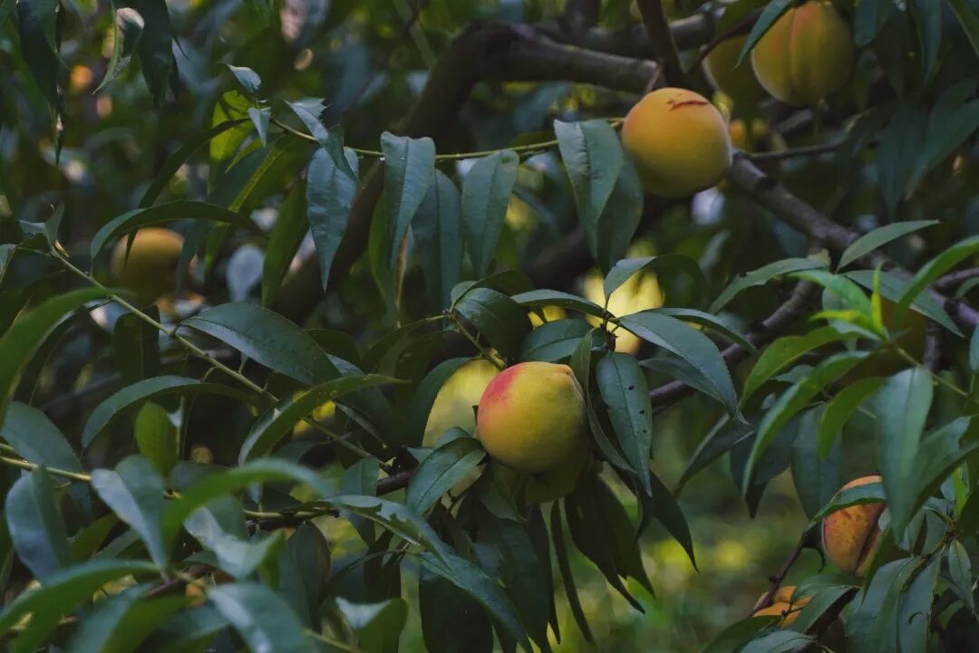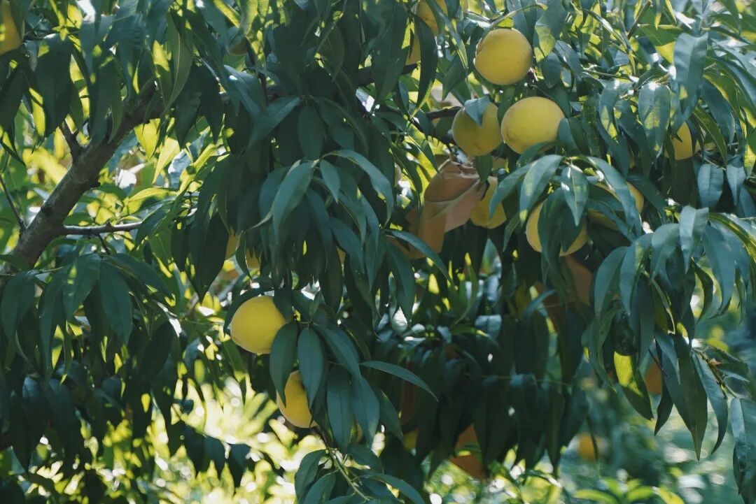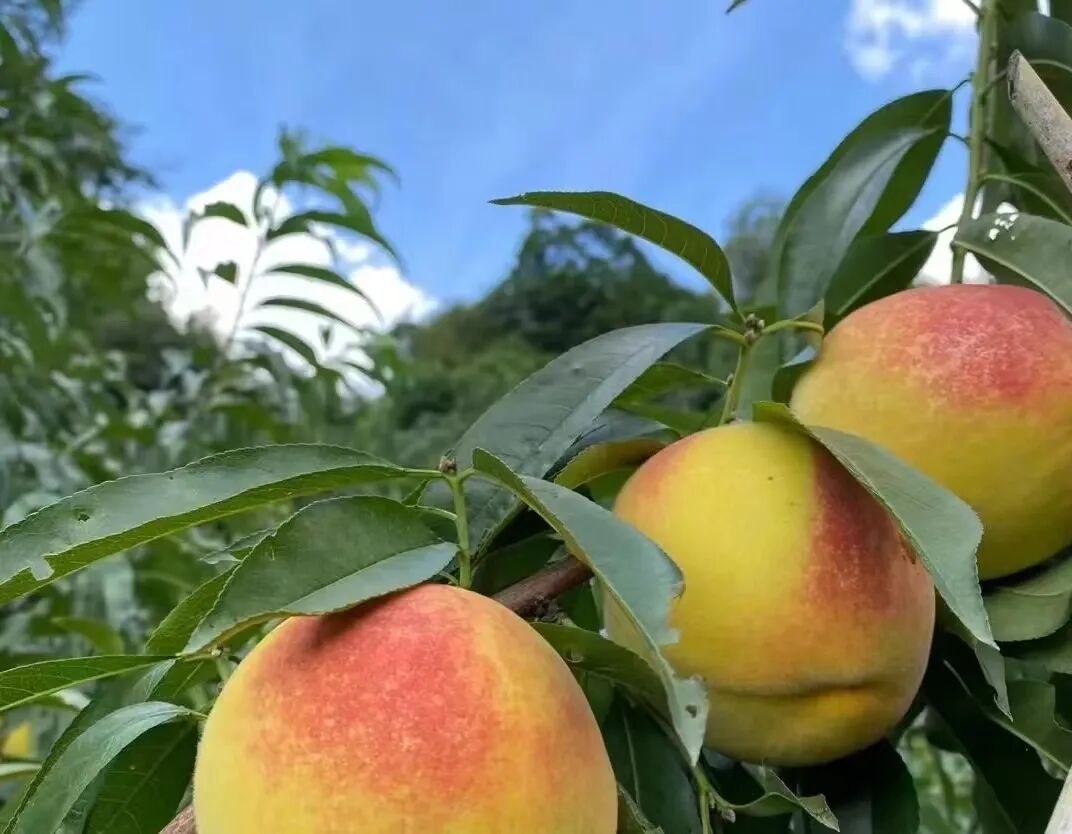 桃林苍翠繁茂,每棵树上的桃子毛绒丰硕、饱满诱人。