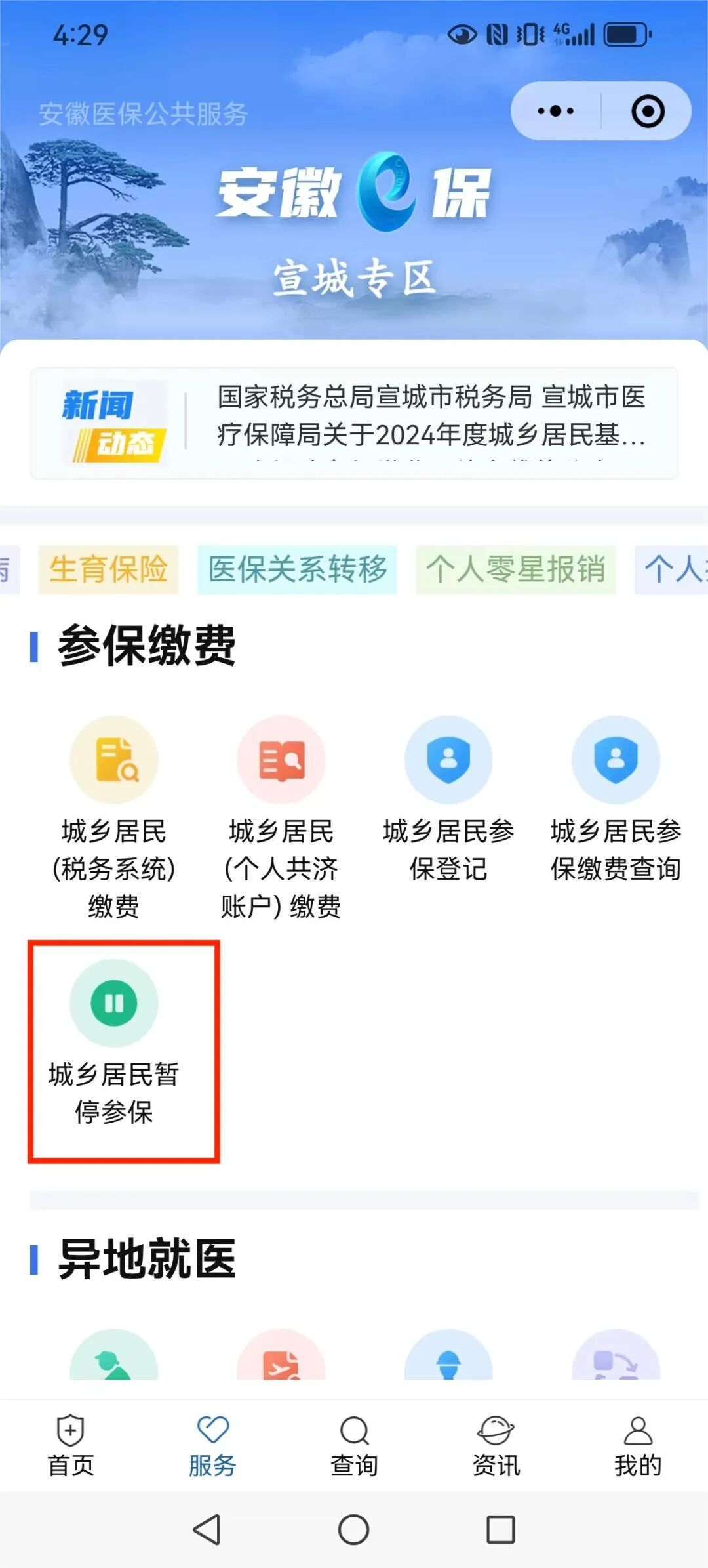 (一)通过微信、支付宝搜索“安徽医保公共服务”小程序,进入上年度城乡居民医保参保地市,选择城乡居民暂停参保模块。